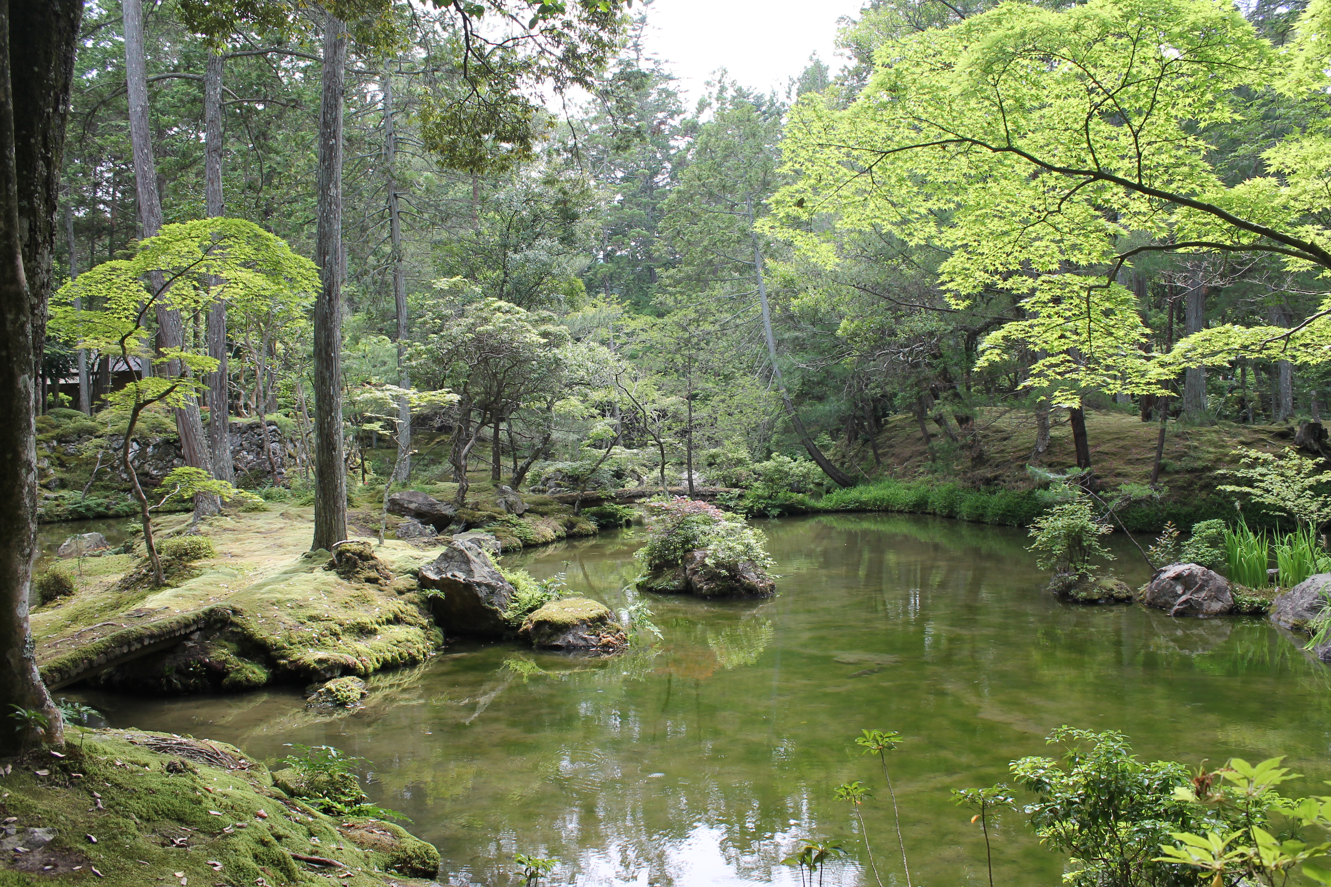 Junto al Templo, el jardín más hermoso del mundo. Una extensión cubierta de arces, murtas, sugis, alcanforeras, abetos, que crecían serenos entre bellas piedras y falsas colinas creadas por el hombre. En el corazón del mismo un estanque de inmortales aguas donde una carpa naranja se paseaba aportando una pincelada de color entre la gama de verdes que predominaba en el jardín. El musgo lo invadía todo. Se extendía como un delicado tejido de diferentes texturas e inapreciables matices que cubría las raíces, las piedras y toda la tierra.